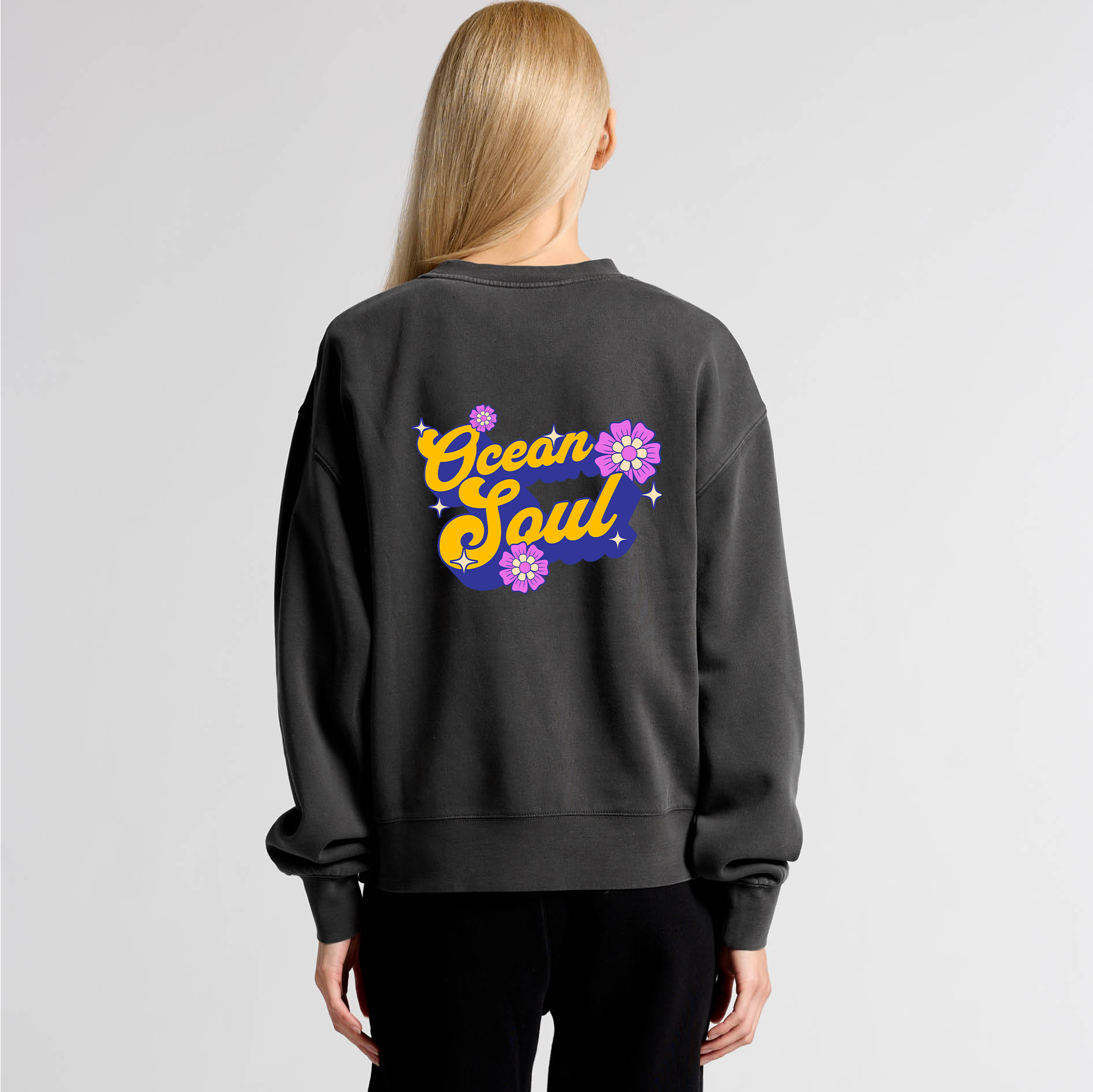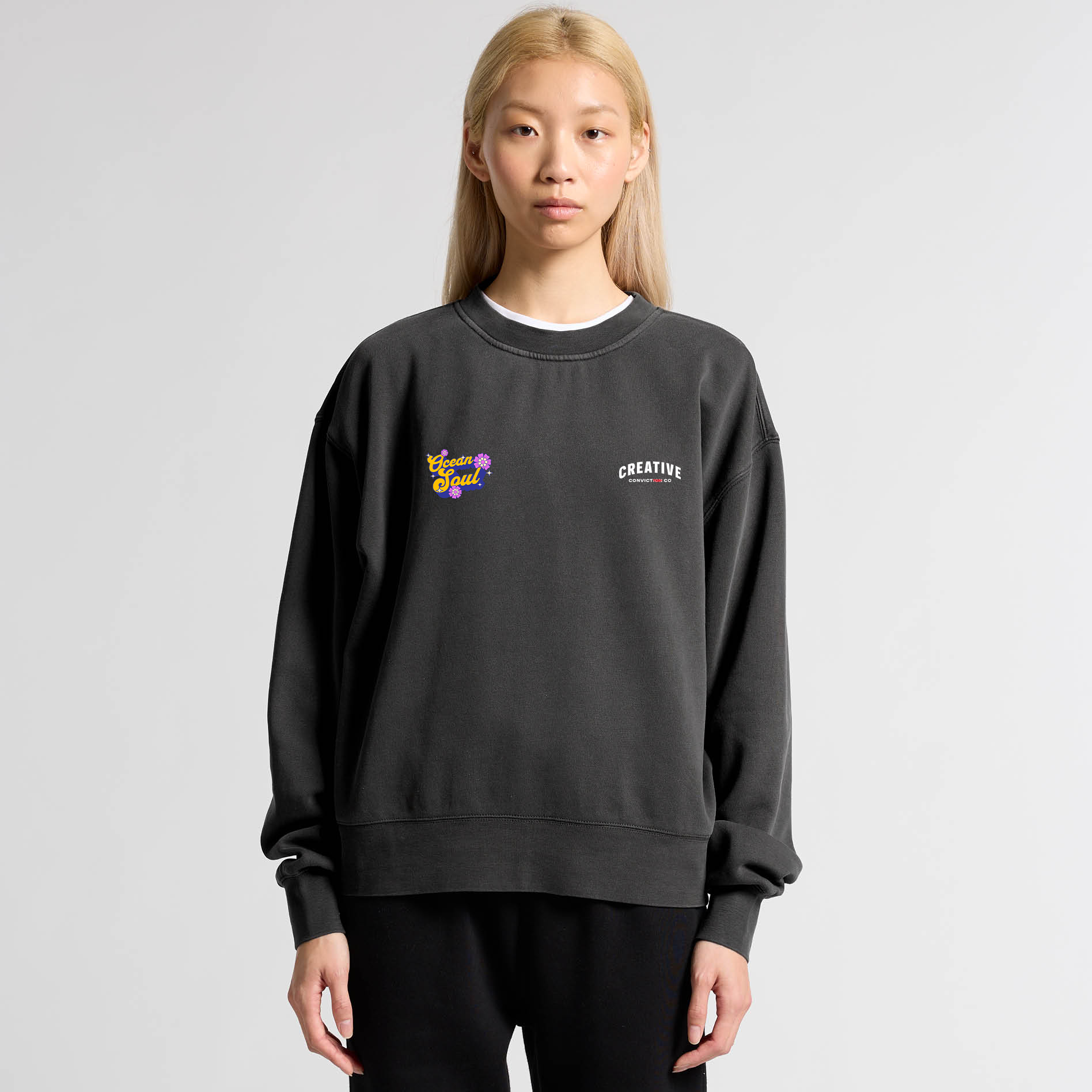 Pullover crew, drop shoulder, crew neck, garment dyed, sleeve cuff ribbing